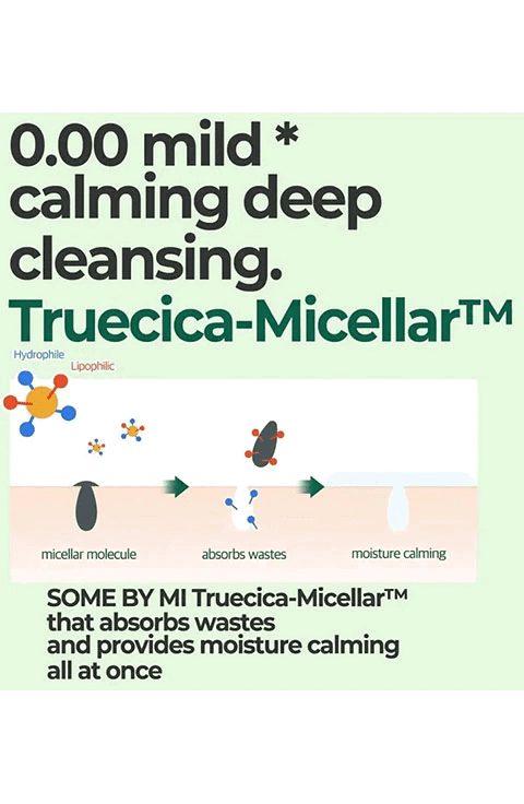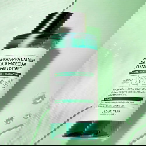 SOME BY MI AHA-BHA-PHA Calming Truecica Micellar Cleansing Water is made from tea tree, mugwort, and centella asiatica for nourishing hydration on skin.